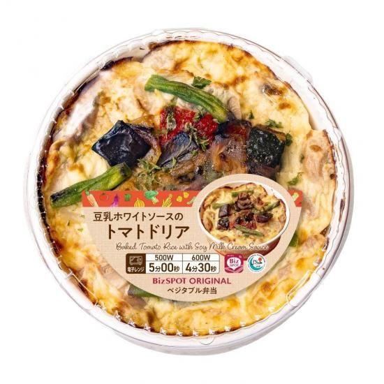 ■トマトで炊き上げたピラフに、豆乳ベースのクリーミーなマッシュルームソースをかけました。